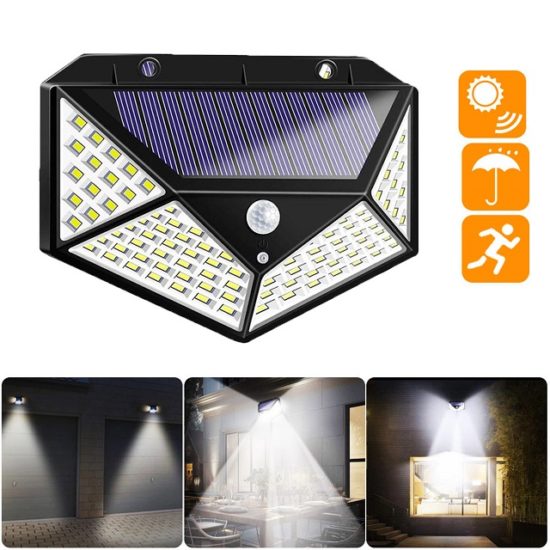 Тези лампи са енергоспестяващи и са с интелигентна система за външно осветление. Компактни, влагозащитени, подходящи са за външен монтаж за осветление на: паркове,градини, вили, къщи, дворове, навсякъде където има нужда от автономно осветление. 100 LED светлини осигуряват супер ярка светлина с максимум 1200 лумена. Лампите имат 3 режима на осветление.