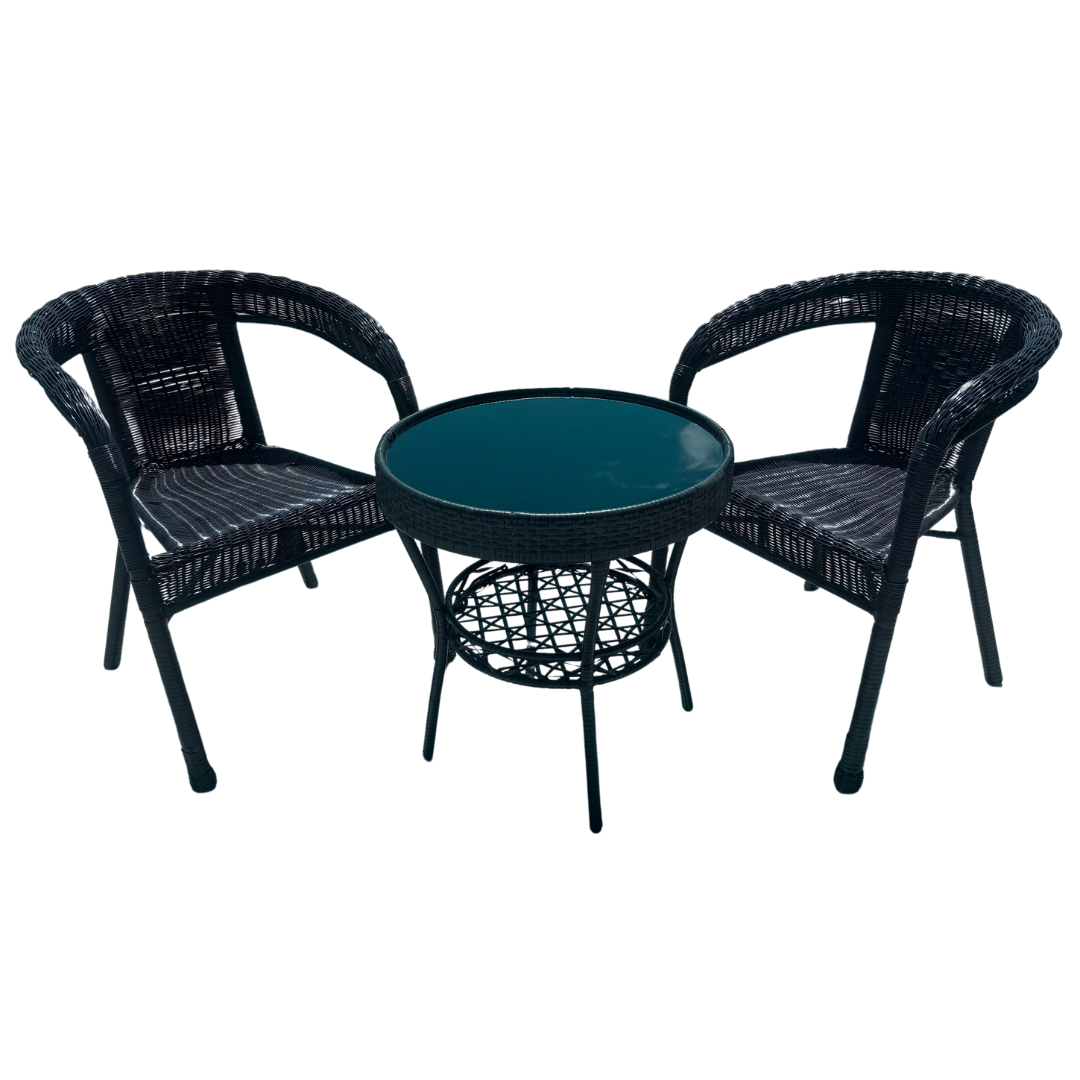 Лесен за поддръжка, той съчетава простотата на минималистичен дизайн, издръжливост и функционалност, за да се избегне подмяната му възможно най-дълго поради променящите се тенденции в дизайна. Комплектът се състои от ратанова кръгла маса с поставка отдолу, покрита със стъклен плот, и 2 ратанови стола, които предлагат необходимия комфорт, за да се чувствате спокойно във всеки момент, прекаран на открито.