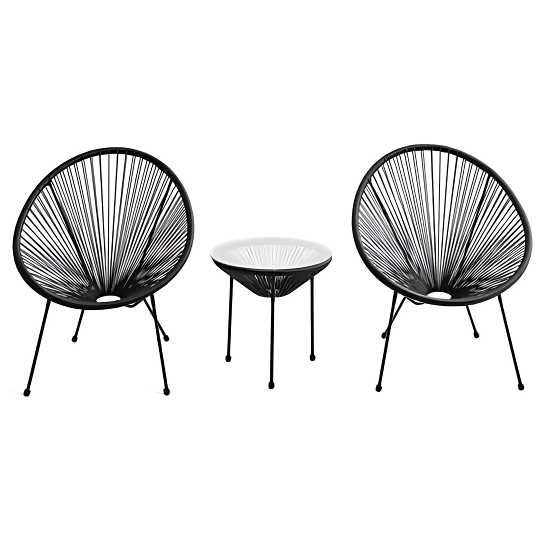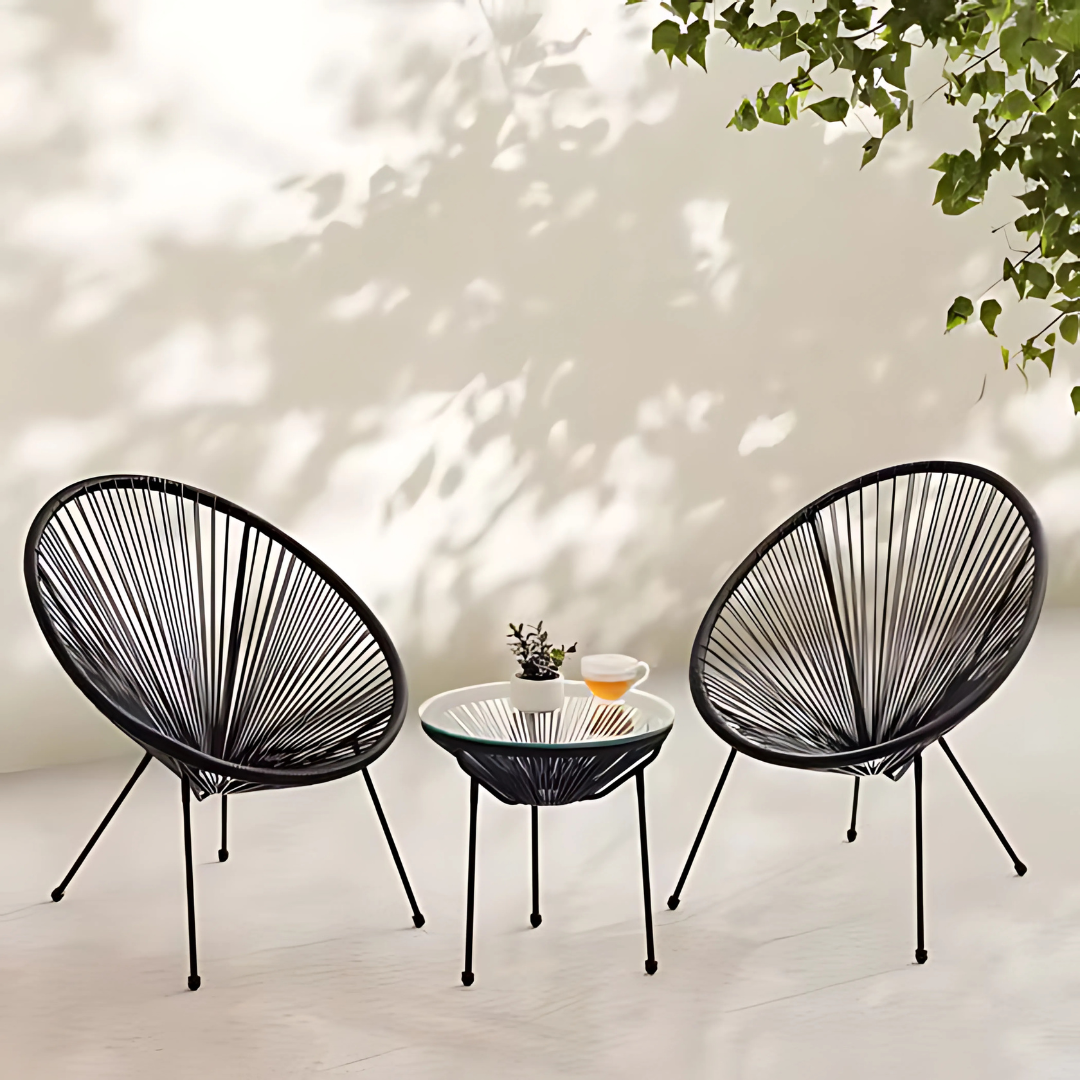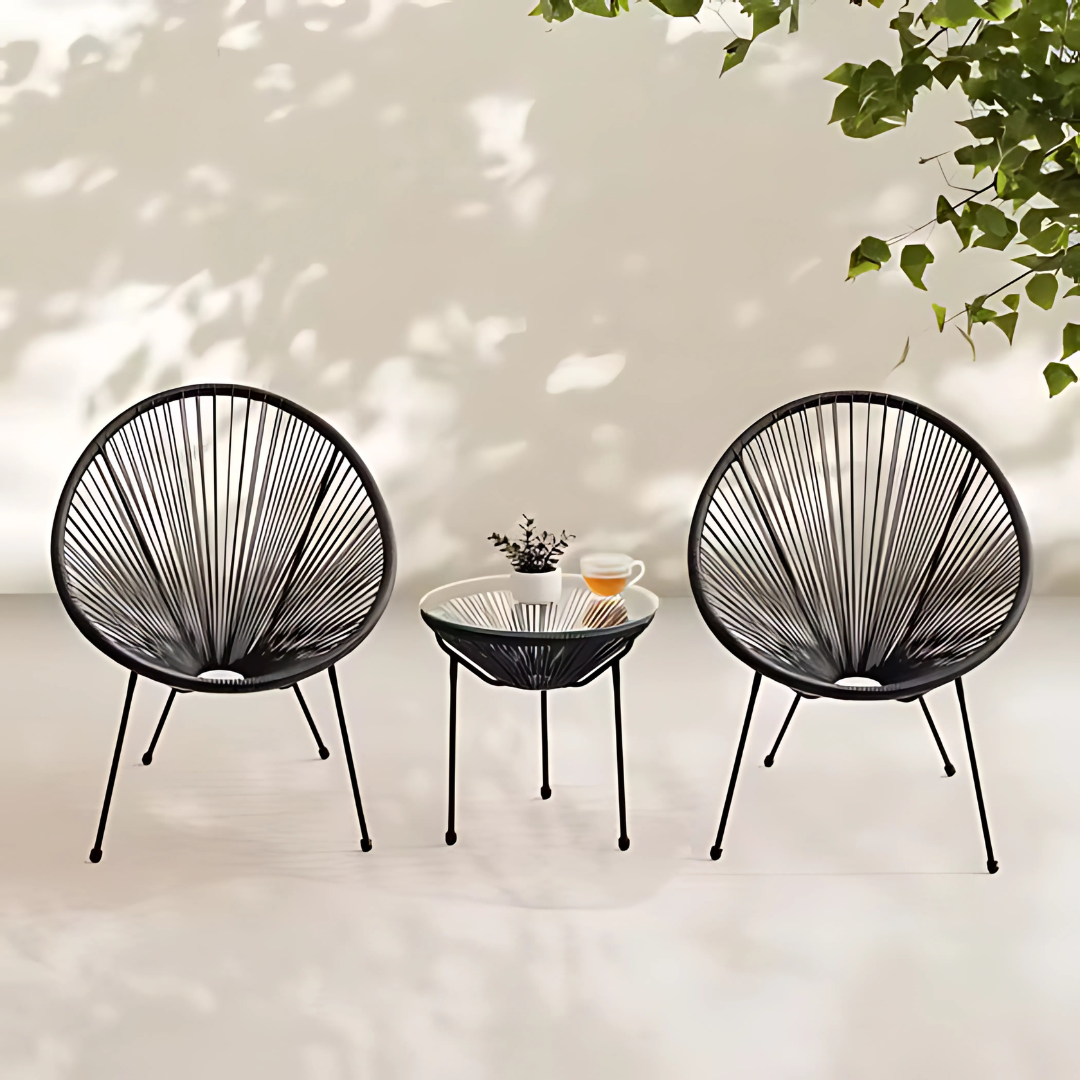 Комплектът включва две елегантни кръгли кресла и компактна масичка. Черната конструкция и геометричните линии придават изтънчен и модерен вид, който лесно се съчетава с различни стилове на обзавеждане.