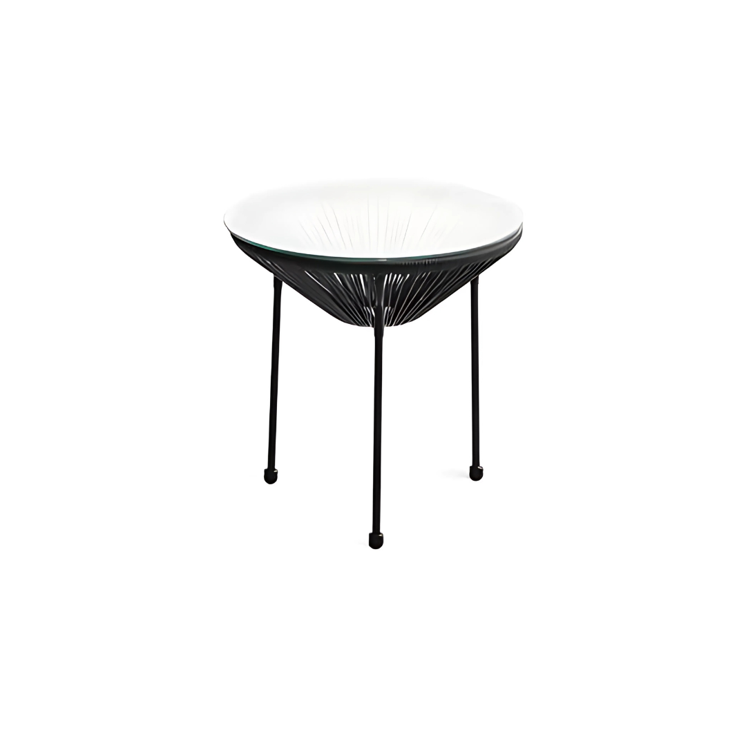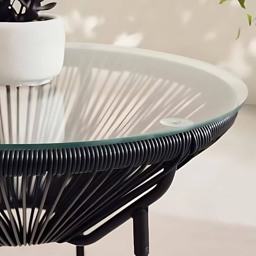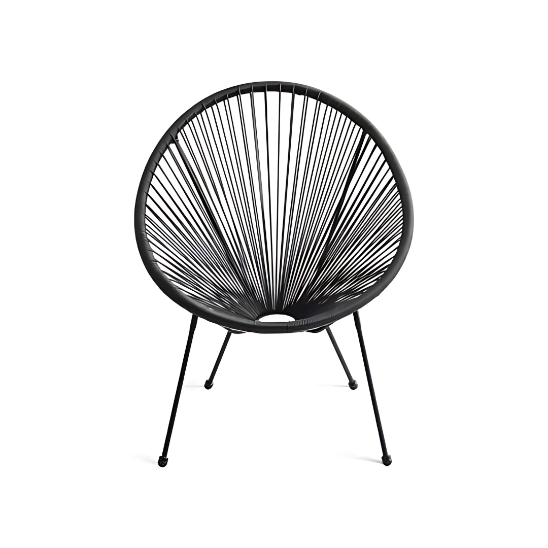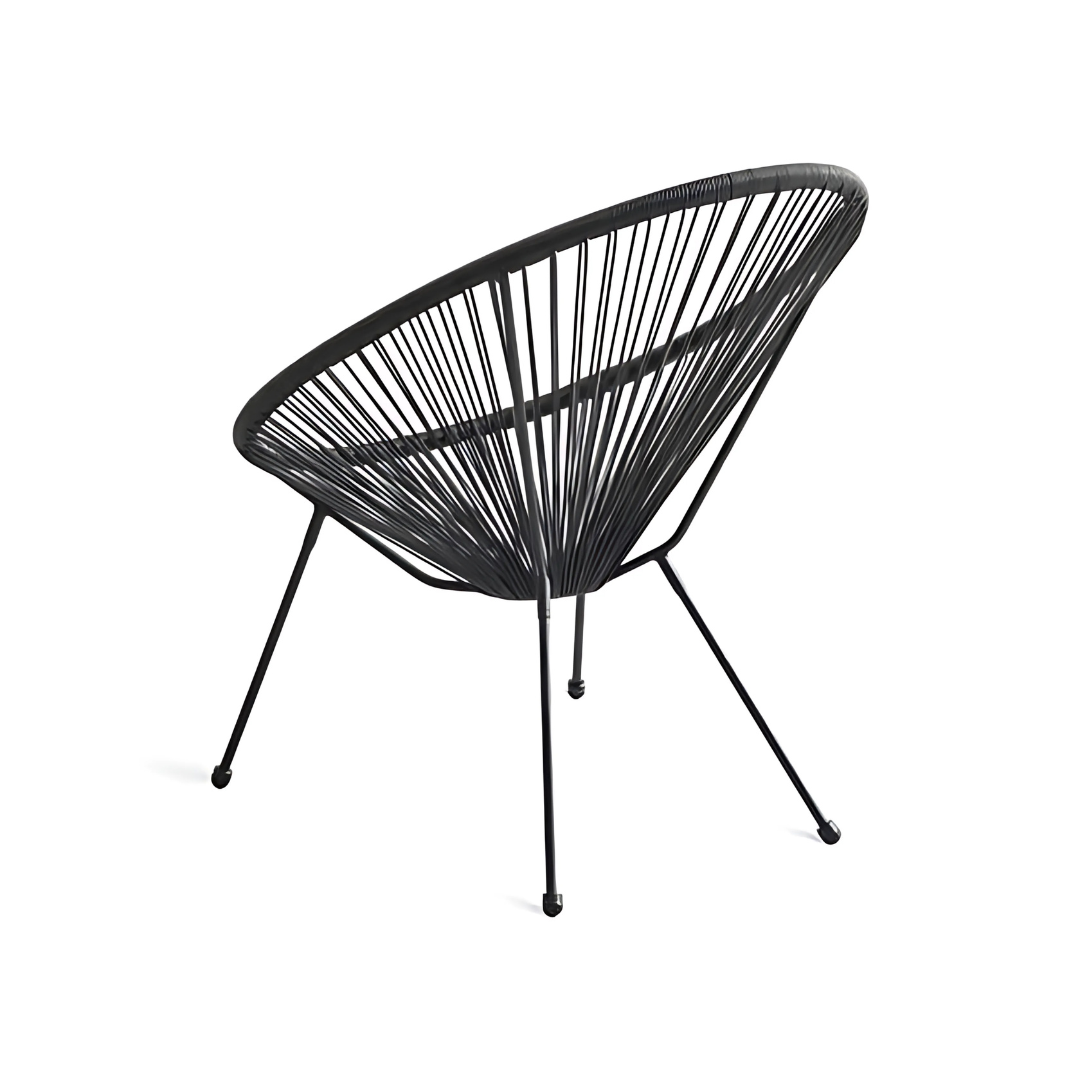 Комплектът включва две елегантни кръгли кресла и компактна масичка. Черната конструкция и геометричните линии придават изтънчен и модерен вид, който лесно се съчетава с различни стилове на обзавеждане.