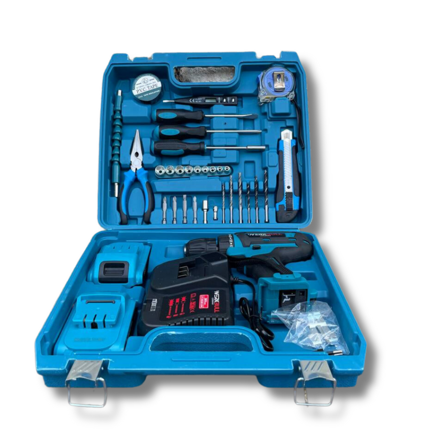 Този комплект предлага разнообразие от инструменти и аксесоари, които ще ви помогнат в различни работи и проекти. Включените акумулаторен винтоверт, батерии, адаптер за прободен трион, ножове и другите инструменти ще ви предоставят гъвкавост и удобство при работата. Комплектът е пълн и идеален за пренасяне и съхранение с включения куфар.