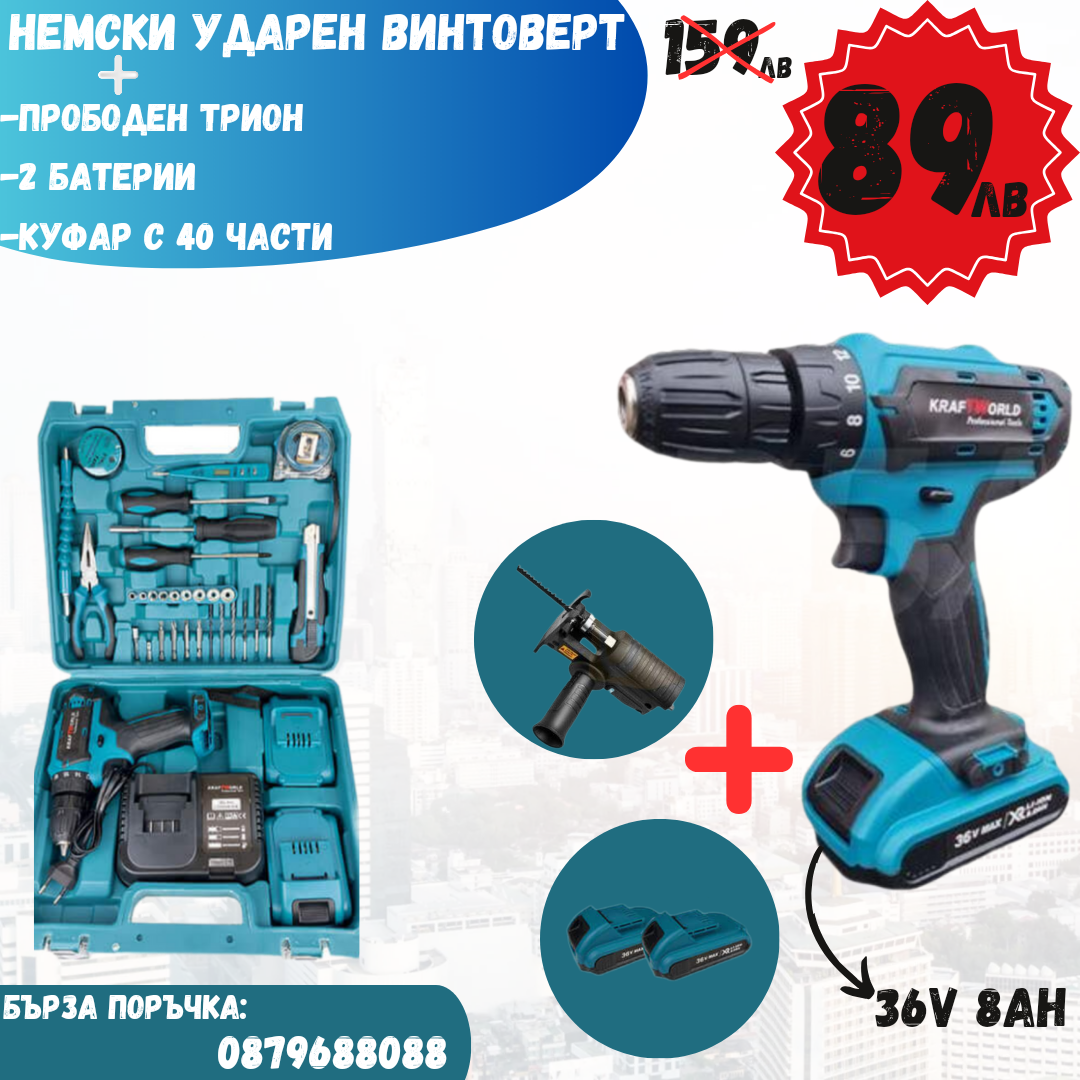 Немски Ударен Винтоверт 40части с две батерии 36 8Ah + Подарък Прободен Трион