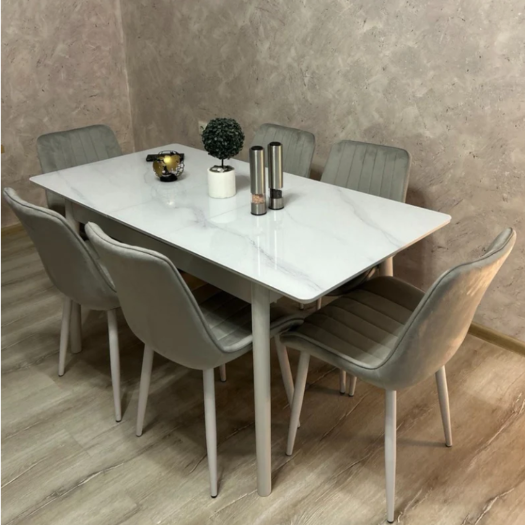 Плотът на "Лорета" е изработен от висококачествено закалено стъкло с изискан мраморен ефект. Този дизайн носи усещане за лукс и съвременна изтънченост, като същевременно осигурява здравина и лесна поддръжка. Закаленото стъкло е устойчиво на надраскване, термични промени и ежедневна употреба – перфектно за модерния дом.